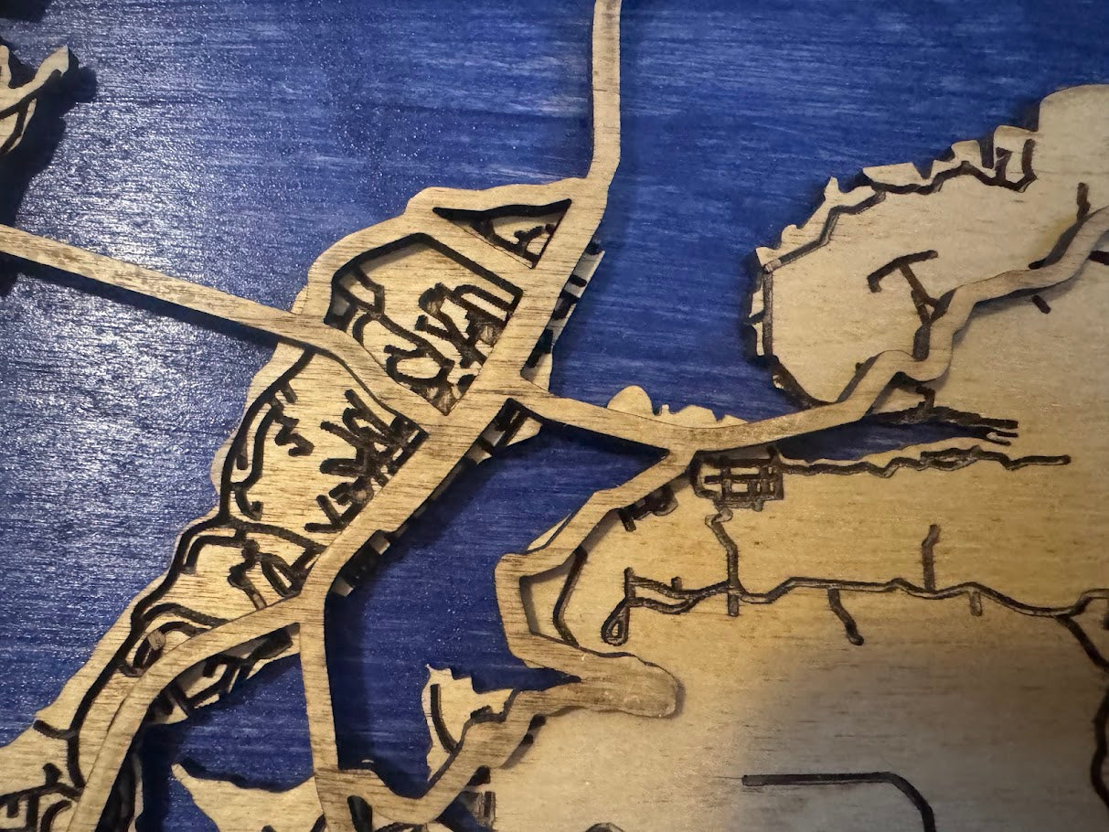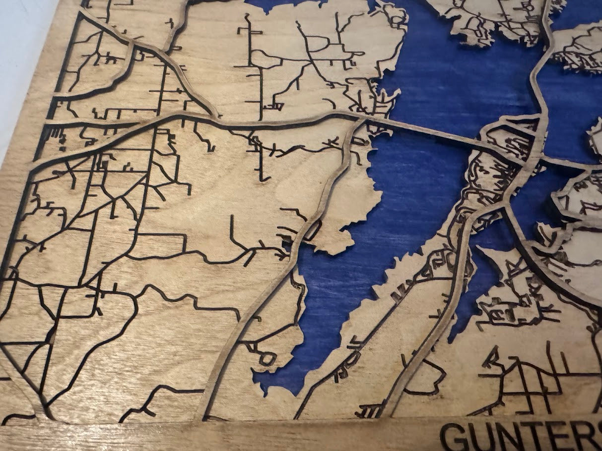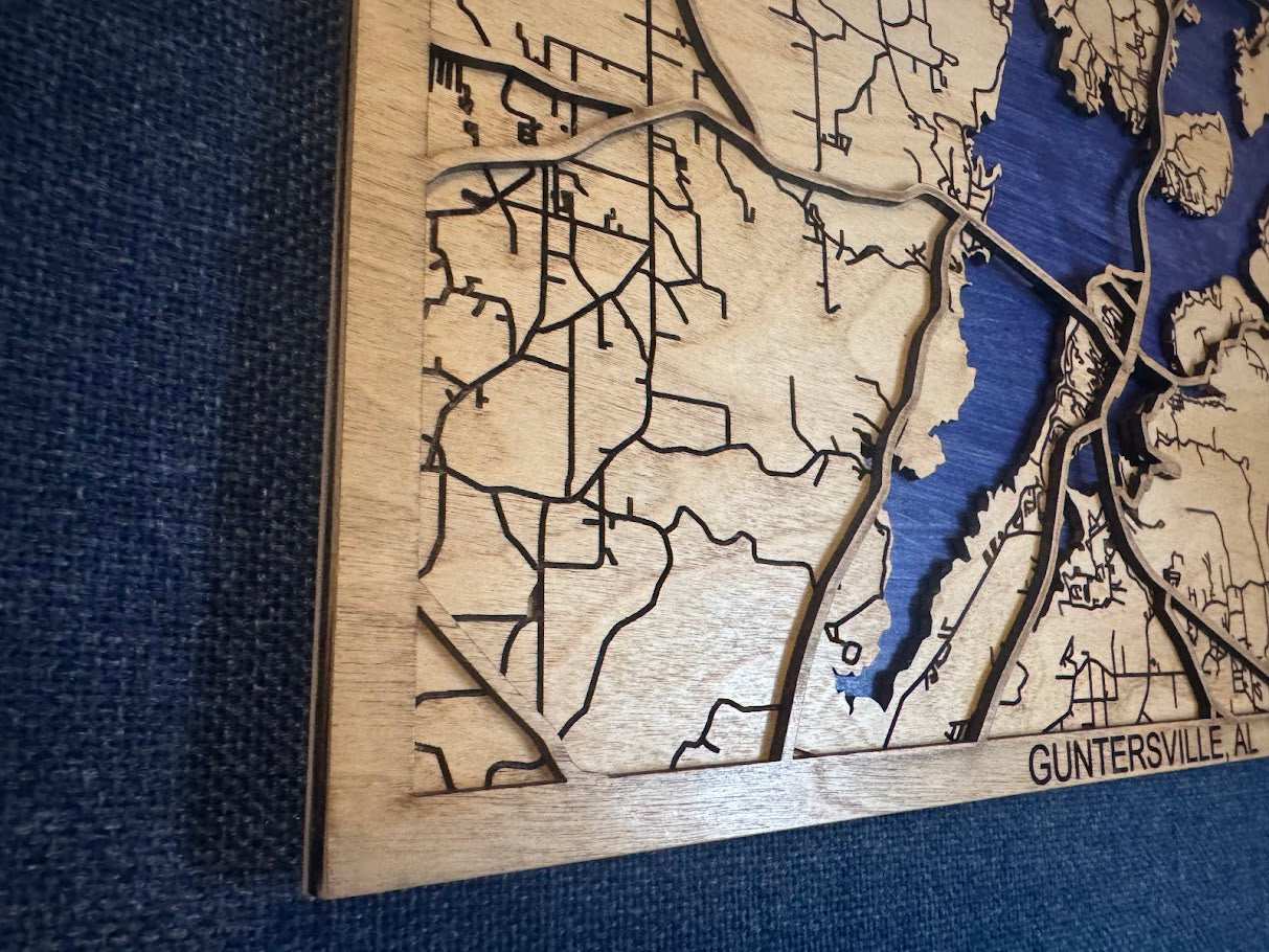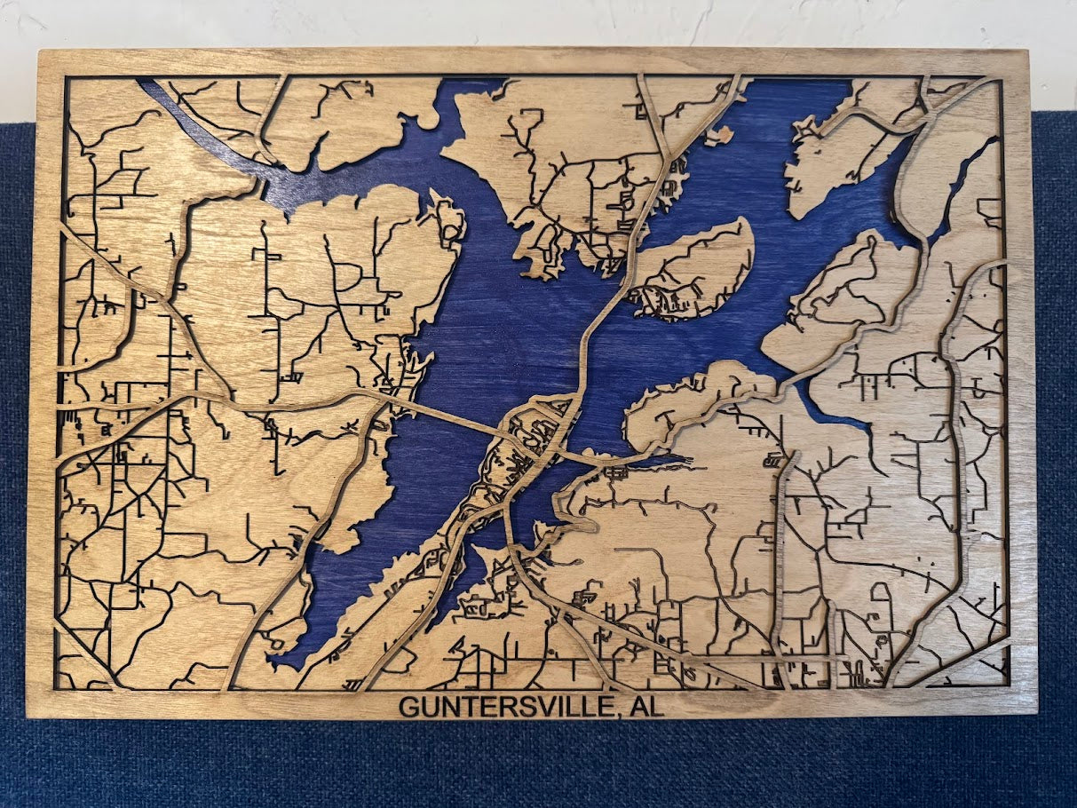 Take a look at Lake Guntersville in Guntersville, AL. This lasered wooden map features main highways and roads in the area.